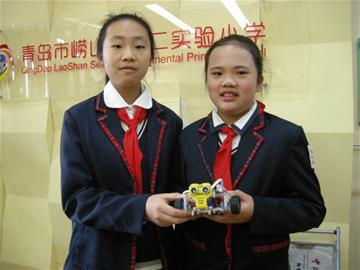 在看到老师分发作业很辛苦后,崂山区第二实验小学的小创客们经过1年多的钻研,自主编程、设计、布线搭建了具有自主知识产权的机器人 “智能课代表”。崂山实验二小还自编了全国第一套机器人创客校本教材。五年级的郝冠霖是个细心的孩子,他发明了 “旋转量角器”和 “可换内容的袖章”,两项发明均在市一级科技创新大赛中获奖。