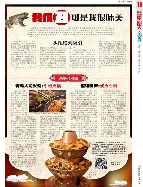 皮肤粗糙、体色暗淡、眼球凸出、叫声如牛……在看重颜值的美食圈里,这般长相的确不是一种美丽的食材,但丑陋的牛蛙却用生命向人们诠释“我很丑,可是我很味美”。牛蛙的做法很多,上海风味的牛蛙面、湘菜式的口味牛蛙、川味的水煮牛蛙……但最火爆的牛蛙吃法莫过于牛蛙火锅和炭火牛蛙了。寒冷的冬日守着热气腾腾的锅子才是冬日饮食最温暖的打开方式。本期美食对对碰,我们就来看看牛蛙火锅和炭火牛蛙是如何让食客们欲罢不能的。