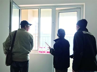 从门窗到水电,从地面到墙面,验房师们有条不紊地按顺序进行检验。首先检查的是门窗问题,验房师岳工拿着一个手电筒,通过变换灯光角度寻找防盗门、塑钢窗的划痕,并且很快找到了门窗的暗痕。在检查客厅时,岳工还发现阳台门扇上部轻微翘曲,导致阳台门闪缝较大。“若是没有专业人员来检查,自己是不会注意不到的这些问题,验房师实在是太专业了。 ”历先生说。