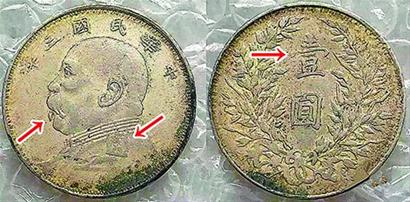 1.模仿官方铸造的“袁大头”版银元,图案、大小、厚度、重量都接近正规机制币,年份多数为“中华民国三年”,也分别有“中华民国八年造”“中华民国九年造”“中华民国十年造”等。偶尔也发现有“中华民国四年”“中华民国五年造”“中华民国七年造”和双面同图、正背面对倒等奇形怪状的臆造品。