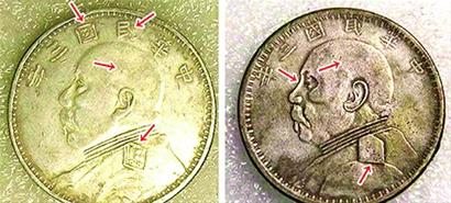 2.工艺简陋,制作粗糙。由于地方军阀和民间工艺均赶不上官方制作条件或水平,私铸版与官方版有明显区别,要么字体不规范,要么正面袁世凯头像变形,要么背面“嘉禾图”零乱,要么制作简陋粗糙。如业内所说,私铸版由于制作工艺水平有限,很难出现一模一样的银币,因而产生在币面上有不同差异的现象是常态。