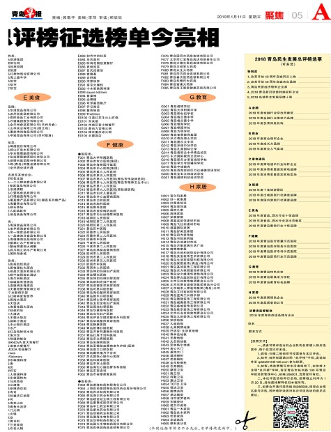 ●肉食类品牌:E001青岛华清食品有限公司E002青岛波尼亚食品有限公司E003烟台喜旺食品工业有限公司E004青岛万福集团股份有限公司E005青岛金乐州食品有限公司(乐州肉食)E006山东山孚实业有限公司(厨王鸡)E007青岛潘家烤鸡食品有限公司E008青岛亨冠食品有限公司(李村脂渣)●酒水饮品类:E009青岛啤酒股份有限公司E010青岛崂山矿泉水有限公司E011青岛华东葡萄酿酒有限公司E012烟台张裕葡萄酿酒股份有限公司E013青岛琅琊台集团股份有限公司E014新华锦(青岛)即墨老酒有限公司E015四川全兴酒业球兴酒●粮油糕点类及其他企业:E016胡姬花花生油E017青岛一二三粮油食品有限公司E018青岛皇家食品有限公司E019青岛法滋蛋糕E020青岛心壹客食品有限公司E021青岛灯塔酿造有限公司E022青岛嘟真蜂产品有限公司(嘟真系列蜂产品)E023青岛海馨茶业有限公司E024青岛崂石茶场E025垦荒人食品超市E026青岛涵岛食品有限公司●海产品类:E027青岛海滨食品有限公司E028青岛老尹家海参有限公司E029青岛帝一铭食品有限公司E030青岛一品康海洋食品有限公司E031青岛海福康海珍品有限公司E032上海蟹都汇水产有限公司E033蟹天蟹地阳澄湖大闸蟹E034青岛百川海之纳水产有限公司E035青岛国际海参城●宾馆餐饮类:E036青岛鲁商凯悦酒店E037青岛香格里拉大酒店E038青岛丽晶大酒店有限公司E039青岛颐中皇冠假日酒店E040青岛海尔洲际酒店E041李沧绿城喜来登酒店E042青岛温德姆至尊酒店E043老船夫餐馆管理有限公司E044 1907光影俱乐部E045青岛红树林度假世界E046青岛黄海大酒店E047东海大饭店E048青岛海景花园大酒店E049西村叔叔的店E050即东大酒店E051汇泉王朝大饭店E052青岛威斯汀酒店E053青岛中心假日酒店E054上桥水产E055开海红岛海鲜虾水饺E056船歌渔水饺E057中航翔通游艇会E058CASANOVA意大利餐厅E059梦拉诺意大餐餐厅E060 LAMODA花园餐厅E061 7sensesE062 TheVisionaryE063烧得乐韩国料理E064润拉面E065鼎福会E066青柳怀石E067朴大人韩国料理E068姜虎东韩国烤肉E069融合马来西亚E070撒椒江湖菜E071奥维斯啤酒花园E072萝喜寿司E073锅佰味重庆江湖菜E074喜寿司E075青岛海林山庄E076旺顺阁鱼头泡饼E077朝天门火锅E078开火火锅E079大龙焱E080姜太御日料E081盛罗兰美食苑E082小龙坎老火锅E083初代宇治抹茶E084乌苏集市E085听海花园创意餐厅E086西树泡芙E087吕氏疙瘩汤E088肯德基E089吉野家E090宋家族亭E091南京大牌档E092小木家韩国料理E093 sauce kitchenE094鲁菜根E095全聚德E096可罗嘉西餐厅E097乔记渔庄E098簋街味道E099 TheDinerE0100牛道红花牛火山石烧E0101东来顺E0102市南区宴小馆餐厅E0103鼎尚九宫格火锅E0104辣庄重庆老火锅E0105北疆饭店