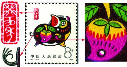 第一轮T80“癸亥年”假邮票,在20多年前的邮市上就有不同版别。因当时造假者受设备条件的限制,无法完成影雕套印的制作工艺,基本上都是胶印或丝印。随着现代高新技术在印刷业的广泛应用,后期发现的T80“癸亥年”假邮票,在印制工艺上采用了比较先进的技术,其手段是仿影雕版原理,用激光机制作雕刻布线图文和影写凹版图文。由于没有原始的设计图,只能采用真邮票作图稿经电子分色制作布线图和凹版图,使其融入影雕版原理,给人从视觉上像是影雕套印,但在套印成像效果上有很多变体。笔者把被鉴定的T80“癸亥年”假票与T80“癸亥年”真票,用同步法放大观察,两枚邮票在刷色上的色调差别较大,假票的红、绿、黄、黑主色偏淡,而且红色覆盖了三分之二的黑色纹线,黑色纹线变成了闪光的褐红(丝印UV油墨特征),红桃下部的黑色弧点线和圆圈丢失等。还有三处地方的差别十分明显:一是猪鼻子无孔;二是猪耳朵黑纹线变红色;三是猪肚皮下面的纹线残缺不堪。再进一步把真T80“癸亥年”邮票三处局部的特征放大:“癸亥年”阴(白)文篆体印章运刀利落;尾巴线描刀法干净;红桃绿叶非常醒目,影雕套印色彩规整,立体感强;特别是猪图案的整个布线和面值“8”字的凹凸纹理线条,着墨厚实,刀工利索、有劲。而假票在这几个方面,存在的差距较大。虽然仿影雕版原理印制的假T80“癸亥年”邮票,在工艺上显有影雕套印的蒙蔽性,只要我们使用基本的鉴定工具,按照上述的辨别方法,从网点、层次,色调、轮廓等方面认真观察,辨别真假影雕套印并非难事。