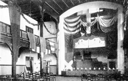 俱乐部北侧是一座宽约14米,纵深约20米,建筑面积约316平方米,平均高度达9.59米的木构拱顶礼堂。礼堂一层采用木质镶板,天花板用灰泥,前端设带更衣间的舞台,厅内的三面墙设计为回廊式,木廊环绕的空间能容纳座席约200个,及若干立席。礼堂室内装饰较简单,但看台的立柱和上方檐口还是以雕刻纹样进行了装饰。在这里,除了上演由驻防士兵、侨民演出的各类剧目,还定期上映彼时最时髦的无声电影。通常在一年一度的换防仪式结束后,士兵们都会带着自己的新朋旧友们逛逛大鲍岛的中国商店,再顺路来到俱乐部喝上几杯,并高谈阔论德国及其在远东的这块属地。