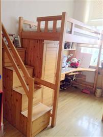 张女士:转让复式高架床,纯实木材质,集成了书桌、衣柜、上层床,带棕榈床垫。长2米、宽1米、高1.8米,2013年购买原价3500元,现在1500元转让可议,香港西路自提。