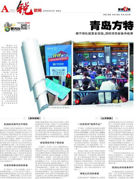 7月21日,家住平度的孙女士与同学带着两个孩子到方特游玩。孙女士表示,当天他们是下午4点进入方特园区的,在玩了几个项目到达“逃出恐龙岛”时,已经是下午6点半了,“逃出恐龙岛”门口的工作人员告诉他们现在不能进,要等1个半小时以后。孙女士问为何要等这么久,工作人员回答说“里面人多”,但孙女士表示并没有在入口看到排队的人群。工作人员表示,如果不想等,可以花80元买张快速通道的票。除了孙女士他们4人,还有几个人也以同样理由被拦在了景点外面。孙女士和同学商量,如果等,就要到晚上8点了,而该项目的游玩时间明确规定截止到晚上7点半,也就是说即使排到了,也不能玩了。两人觉得,要玩这个项目,4个人要多花320元,有些不值,无奈只好放弃了。