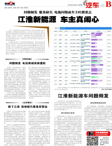 新能源汽车刚刚起步,与同行业相比,江淮新能源在保修政策和做法方面有太大差距。如果你也是江淮新能源车主,在用车、维修过程中存在哪些问题,可以通过热线电话和微信与我们联系。 本报记者
