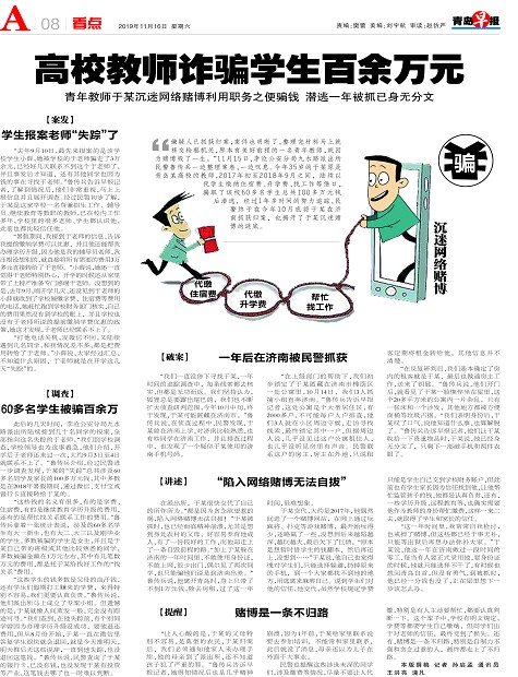 青年教师于某沉迷网络赌博利用职务之便骗钱 潜