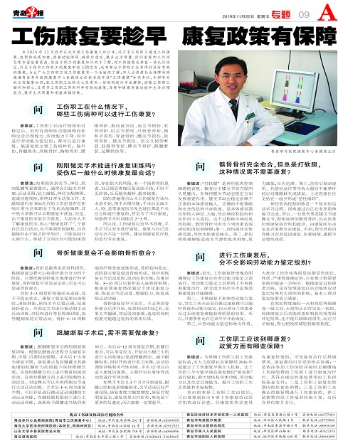 自2015年11月我市正式开展工伤康复工作以来,近万名工伤职工通过工伤康复,在预防残疾加重、改善功能障碍、减轻后遗症、提升生活质量、回归家庭和工作岗位等方面显著获益。但由于职工对康复知识的不了解,对工伤康复还存在一些认识误区,以至于我市工伤职工的康复率仅10%左右,还有部分工伤职工没有得到及时有效的康复。为让广大工伤职工对工伤康复有一个全面的了解,市人力资源社会保障局特邀请青岛阜外医院康复中心姜德波主任在本报开设“工伤康复”知识专栏,介绍有关的工伤康复知识,就工伤职工比较关心及常见一些病例进行专业解答,消除工伤职工疑问和担心,让更多工伤职工得到科学有效的康复,改善和提高身体功能和生活自理能力,提升生活质量和家庭幸福指数。