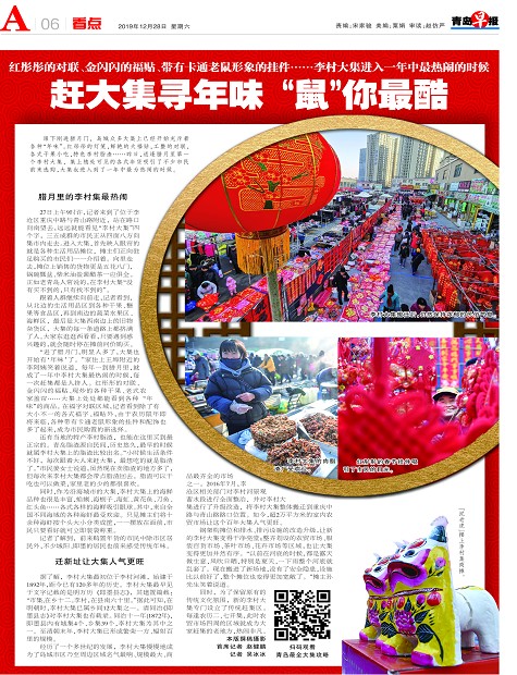 “进了腊月门,明显人多了,大集也开始有‘年味’了。 ”家住上王埠附近的李阿姨笑着说道,每年一到腊月里,就成了一年中李村大集最热闹的时候,每一次赶集都是人挤人。红彤彤的对联、金闪闪的福贴、现炒的各种干果、老式农家盖帘……大集上处处都能看到各种 “年味”的商品。在福字对联区域,记者看到除了有大小不一的各式福字、福贴外,由于农历鼠年即将来临,各种带有卡通老鼠形象的挂件和配饰也多了起来,成为市民购置的新选择。