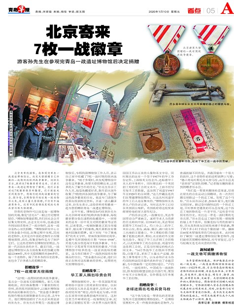 “这7枚一战期间的欧洲战争徽章,是北京一位游客无偿捐赠的,前几天刚刚收到,我们准备整理一下徽章的相关资料,将其陈列到展馆中,以填补博物馆欧洲战场徽章的空白。 ”贺金嘉手捧着7枚制作精良的铜制徽章告诉记者,去年9月,他们博物馆接待了从北京来青旅游的孙先生。孙先生在参观完一战遗址博物馆后,专程找到博物馆工作人员,表示自己家中收藏了7枚一战时期的欧洲战争徽章。 “刚才参观时,我发现博物馆中没有这类徽章,我要无偿捐赠出来,让更多的人了解当年的历史。”孙先生告诉工作人员,他是收藏爱好者,数年前从国外收集了7枚欧洲各国的战争徽章,为了解这些战争徽章的历史,他还专门请国外的朋友找到相关资料,并逐一请人翻译过来。孙先生表示,这些资料将和徽章一起无偿捐赠给青岛一战遗址博物馆。