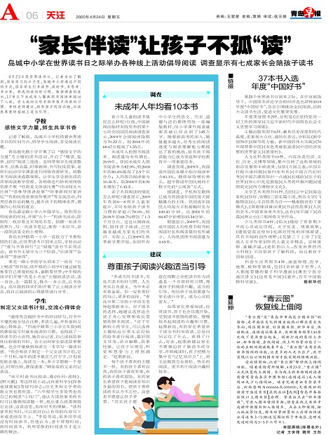 4月23日是世界读书日,记者采访了解到,居家学习的日子里,岛城中小学通过不同的方式,倡导学生们多读书、读好书,多思考、多分享,养成阅读的好习惯。数据调查则显示,17岁以下未成年人整体图书阅读率超过了八成,有七成的父母有陪伴孩子阅读的习惯。学校老师建议,培养孩子阅读兴趣,应该在尊重的基础上适当引导。