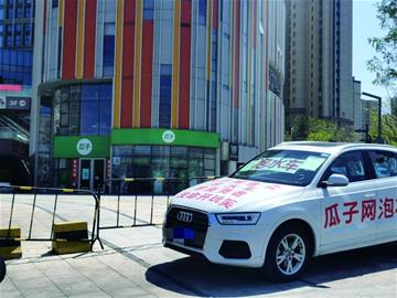 根据网友线索,记者于4月23日来到位于市北区双山街道海尔云街的瓜子网线下门店附近,该门店位于重庆南路和淮安路交叉口,一辆贴着红字的白色轿车停在这家门店前的人行道上。和周围马路上川流不息的车辆相比,这辆“岿然不动”的车看上去很醒目,市民从车辆前经过不禁瞩目,有的还掏出手机拍照。