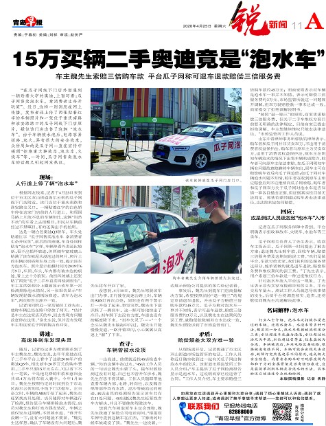 从现场离开后,记者拨通了市北区双山街道市场监管所的电话,工作人员称近日确实收到过一起有关瓜子网出售泡水车的投诉。该街道市场监管所工作人员介绍:“车主提供了瓜子网检测报告显示是泡水车,这说明商家已经违背了合同。 ”工作人员介绍,车主要求赔偿三倍购车款约45万元;而商家则表示对车辆是泡水车一事并不知情,表示可赔偿三倍服务费约3万元。市场监管所就这一问题展开调解,但双方就赔偿款一事未达成一致,商家提交了拒绝调解说明书。
