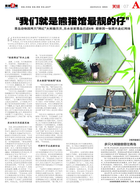 “原来青岛动物园里有大熊猫呀!”“动物园里有几只大熊猫?在哪里?我要去看!”6月1日,青岛早报报道《“熊猫贝贝”邀你捐竹林》后,不少市民对青岛动物园的大熊猫十分感兴趣,好奇它们的生活环境是什么样子。6月2日,早报记者来到了青岛动物园,一番打探后才知道,生活在这里的大熊猫乐水和贝贝不仅是兄妹关系,还是两位大明星呢!
