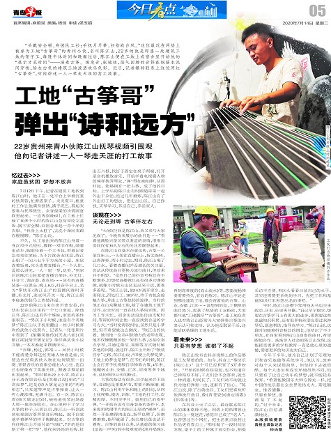 “头戴安全帽,身披民工衫;手抚月牙筝,扫指战台风。”这位最近在网络上被誉为工地“古筝哥”的贵州小伙,名叫陈江山,22岁的他是即墨一处建筑工地的架子工,每逢午休时间和晚餐过后,陈江山便在工地上或宿舍里开始他的“展示才艺时间”——演奏古筝。缓急音、张弛弦,荡气回肠的音符在钢筋水泥间穿梭,给灰白色的建筑工地泼洒欢乐色彩。近日,记者辗转联系上这位网红“古筝哥”,听他讲述一人一琴走天涯的打工故事。