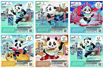 成都大运会主题即开票“炫青春 行大运”共有6个票面,以大熊猫为主形象,年轻时尚呆萌可爱。彩票票面分别以世界文创名城、世界旅游名城、世界赛事名城,国际美食之都、国际音乐之都、国际会展之都的城市形象为设计元素,融入宽窄巷子、川剧变脸、川菜等极具特色的蜀地元素,同时将大运会会徽融入其中,传递大运会核心理念,展示“三城三都”的城市形象。彩票设计秉持文创理念,以手绘元素为主要风格,不仅好玩,还具有收藏价值。