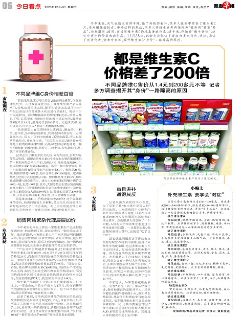 “都说吃维生素C可以美容,还能预防感冒,增强身体抵抗力。不过我看现在市场上各种维生素产品五花八门,价格也是天壤之别,都不知道该怎么选了……”早报记者近日在岛城各大药店进行调查时,现场不少市民这样说。面对琳琅满目的维生素C药品,很多人都犯了难:以常见的1瓶100片装的维生素C为例,最便宜的1瓶只卖1.4元,最贵的卖到200多元。为追求卖相,有的还在药片里加入“果味”,标榜保健功能。