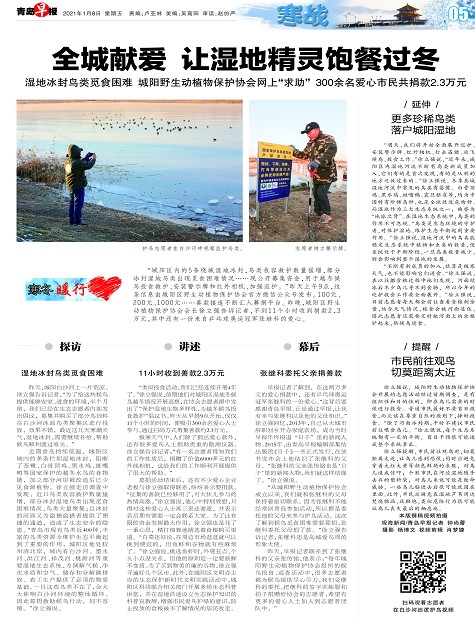 “从城阳野生动植物保护协会成立以来,我们就和张继科的父母保持着密切联系。因为张继科不能经常回青岛参加活动,所以都是委托他的父母来参与护鸟活动。这次了解到候鸟觅食困难需要募捐,张继科委托父母捐了款。 ”徐立强告诉记者,张继科还是岛城爱鸟周的形象大使。