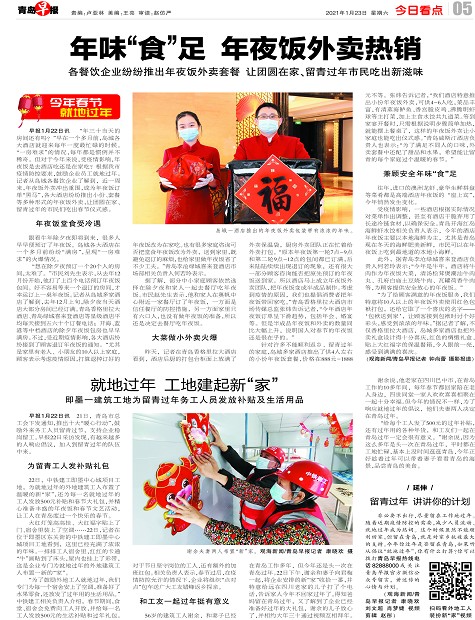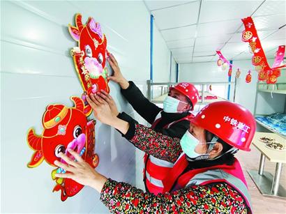 大红灯笼高高挂、大红福字贴上了门、宿舍里装上了空调……22日,记者在位于即墨区东关街的中铁建工即墨中心城项目工地看到,这里已经充满了浓浓的年味。一排排工人宿舍里,红红的卡通“牛”画贴到了床头,屋内也挂上了彩带,这是企业专门为就地过年的外地建筑工人布置一新的“家”。