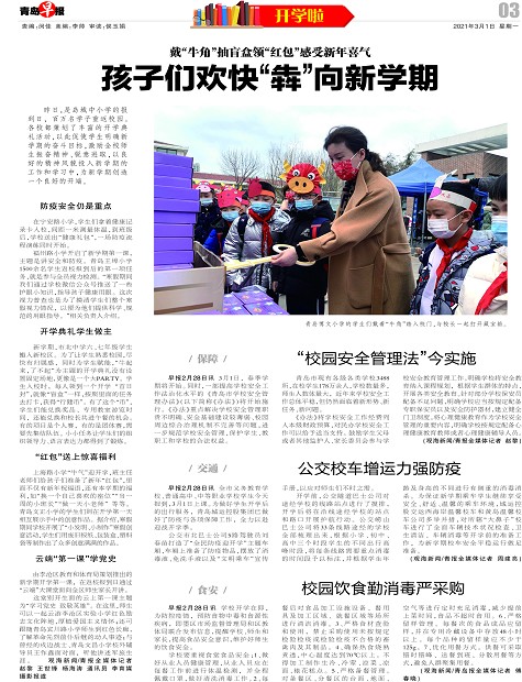 上海路小学“牛气”迎开学,班主任老师们给孩子们准备了新年“红包”,里面不仅有新年祝福语,还有本学期的福利,如“换一个自己喜欢的座位”“当一周的小班长”“做一天小老师”等等。青岛文正小学的学生们则在开学第一天相互展示手中的创意作品。据介绍,寒假期间学校开展了“小发明、小制作”寒假创意活动,学生们用废旧报纸、包装盒、塑料袋等制作出了众多创意满满的作品。