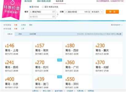 记者通过网上订票平台查询发现,15天之内,青岛飞往国内热门城市的机票折扣力度都很大,其中青岛飞往上海的机票3月8日至11日的价格仅为159元,相当于1.1折;青岛飞往南京的机票在3月6日至11日达到最低,为170元,相当于1.5折;青岛飞往西安的最低价出现在3月16日,价格仅为180元,相当于1.5折;青岛飞往杭州的机票最低价出现在3月18日,仅为220元,相当于2.5折;青岛飞往北京的机票最低价出现在3月9日与12日,仅为400元,相当于2.7折。与此同时,未来两周青岛飞往重庆、昆明、广州等地的部分机票同样是“大跳水”,已经低至3折以下。