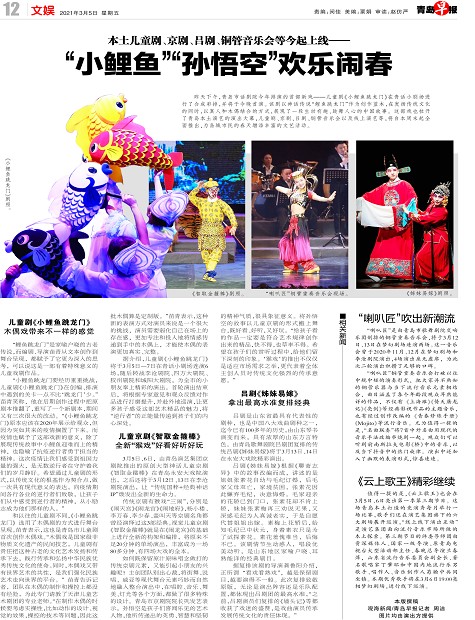 昨天下午,青岛市话剧院今年排演的首部新戏——儿童剧《小鲤鱼跳龙门》在青话小剧场进行了合成彩排,并将于今晚首演。该剧以神话传说“鲤鱼跳龙门”作为创作蓝本,在发扬传统文化的同时,以真人和木偶结合的方式,展现了一段生动有趣、鼓舞人心的中国故事。这部戏也拉开了青岛本土演艺的演出大幕,儿童剧、京剧、吕剧、铜管音乐会以及线上演艺等,将自本周末起全面推出,为岛城市民的春天增添丰富的文艺活动。