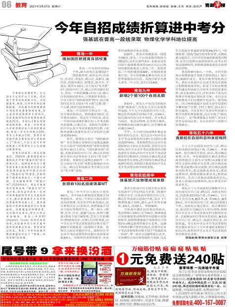 2021年,青岛九中也在自招批次设置“强基班”,但是在入学后依据条件选拔。今年九中自招面向市内三区、崂山区和高新区招收6个班,共300人。综合测试内容与往年相同,分为笔试与面试。笔试分物理、化学两个模块。物理模块测试满分120分,化学模块测试满分100分。