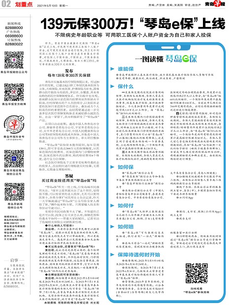 昨天,青岛市商业健康补充保险 “琴岛e保”正式上线。市民既可使用职工医保个人账户资金,也可使用其他资金进行投保,而且允许利用职工医保个人账户余额为直系亲属支付保费,对投保人不限年龄、不限职业、不限身体状况、不限疾病史,无需体检。每年只需139元,即可享受高达300万元的保额。