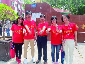 “看我们身上穿的,都是特别定制的! ”身着红色T恤衫,印有“试不可挡”字样的青岛17中高三班主任贾惠自豪地告诉记者。7日上午11时许,距离第一场考试快要结束,贾惠与其他4名17中的老师们又来到了青岛华夏职业学校考点,她告诉记者,“今天,所有的高三老师都出动了,大家分头到十六中考点、六十六中考点、电子学校考点等,只要是有学生在那里考试,哪怕只有三四名自己的学生,也一定会亲自前去,为孩子们加油鼓劲。 ”他们在校外一直耐心等候着,直到看到学生们一个个信心满满地从考场走出来,并一一与学生们拍手、拥抱,然后鼓励他们下午继续放平心态,“一个都不能少”。