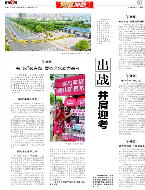 “十年寒窗磨一剑,只待今朝问鼎时”。 6月7日,又一届高三学子奔赴考场,迎接人生中的一次重大考验。为了给考生和场外等待的家长送去一份清凉,昨天起,青岛崂山矿泉水有限公司联合青岛早报、青岛市城市管理局,面向全市所有考点,设立爱心公益“补水站”,向考生及家长提供免费饮用水服务。情满岛城,有“崂”必有获。