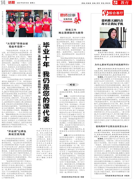 即将从西安电子科技大学研究生毕业、前往上海复旦微电子公司工作的青岛小哥戴睿,在实现人生梦想之时,最难忘自己在超银中学读书时的班主任曲鹏老师。虽然时隔十余年,但是戴睿还对第一次见曲老师的场景记忆犹新,那个比他大十岁的“大哥哥”,教他们数学,而他为曲老师当了整整三年数学课代表。