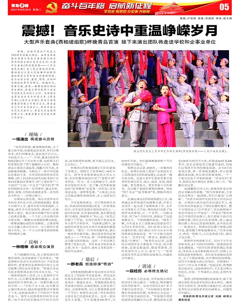 据悉,《西柏坡组歌》首演成功,接下来演出团队将走进学校和企事业单位,继续用艺术的形式,带领观众重温历史,将这部优秀作品呈现给更多的岛城观众,向建党百年献礼。
