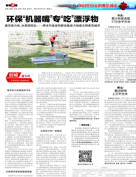 春夏季节在大村河下游区域河面水绵、浮萍、浮泥等水面漂浮物较多,特别是浮泥,易打散不易打捞,人工打捞强度较大,且不彻底。李沧市政公司根据河道水面漂浮物的特性,引进了节能型水面漂浮物收集器,记者在现场看到该设备能自动收集水面浮油、浮渣、浮泥、浮萍、垃圾等多种漂浮物,使浮萍疯长现象得以高效控制。