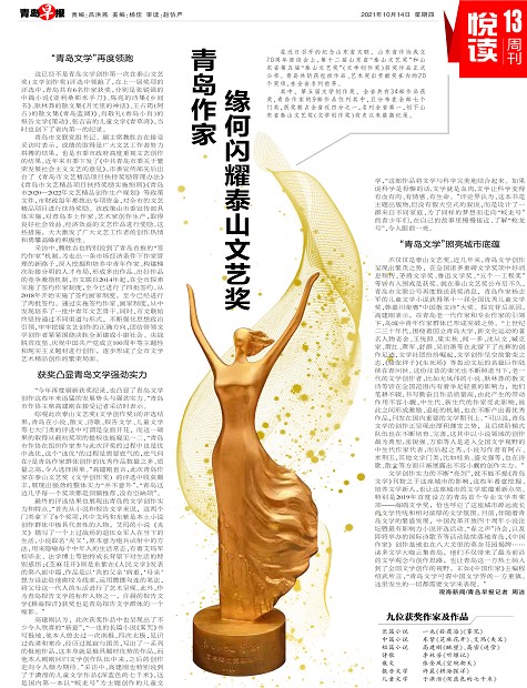 在近日召开的纪念山东省文联、山东省作协成立70周年座谈会上,第十二届山东省“泰山文艺奖”和山东省第五届“泰山文艺奖”(文学创作奖)获奖作品正式公布。青岛共斩获包括作品、艺术突出贡献奖在内的20个奖项,在全省名列前茅。