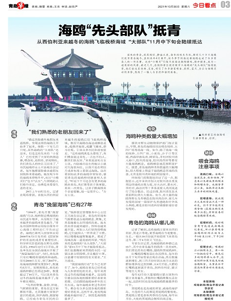 记者了解到,这些海鸥主要来自西伯利亚、黑龙江等地,夏季海鸥在当地繁殖、生长,一般从10月份就开始陆续飞来青岛过冬,第二年4月底又飞回去。