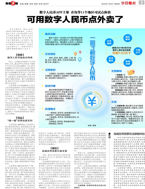 目前,数字人民币试点应用已经涉及岛城衣、食、住、行、购等多个领域,场景日益丰富。
