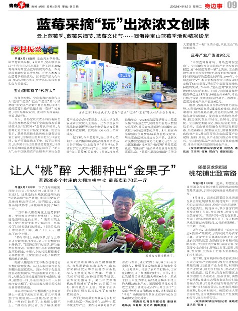 据悉,西海岸新区坚持对内聚力强品牌,对外造势拓市场,通过政府推动、扶持和引导,培育强势品牌,打造知名品牌,实施名牌带动战略,促进农业结构优化升级,推动现代农业市场化、品牌化、信息化。宝山镇党委副书记、镇长陆泉龙介绍,近年来,宝山镇按照融合型果品发展思路,拓宽新路径,探索新业态,做精做强特色优势产业,用实际行动为宝山蓝莓产业赋能、提档、升级,以产业振兴推动乡村振兴。宝山特色果品产业已成为百姓致富增收、推动实现共同富裕的黄金产业。