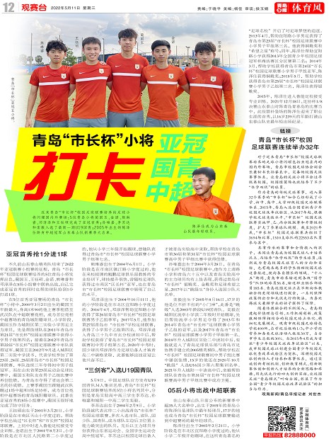 近来青岛“市长杯”校园足球联赛培养的足球小将闪耀国内外赛场:5位青岛小将蔺国玉、金诺、熊琳睿、邓淳泽和王钰硕完成了亚冠首秀;孙唯嘉、李苏达和栾毅入选了最新一期U19国青;2005年出生的陈泽仕跻身中超冠军山东泰山队新赛季大名单。