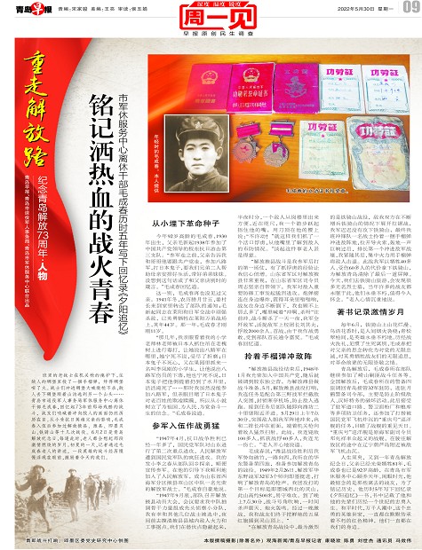 班里的老战士在机关枪的掩护下,往敌人的碉堡里投了一捆手榴弹,炸得碉堡哑了火。战士们冲进碉堡大喊缴枪不杀,敌人丢下碉堡顺着山沟逃到另一个山头……青岛市退役军人事务局军休服务中心离休干部毛成春,回忆起73年前那场残酷的战斗,战友们呐喊着冲向敌人的画面仍然历历在目。从小受抗日英雄父亲的影响,毛成春入伍后参加过解放掖县、潍县、即墨灵山、铁骑山等十几次战役。 6月2日是青岛解放纪念日,每逢此时,老人都会想起那段激情燃烧的岁月。初夏的一天,记者通过毛成春老人的讲述,一段英雄的战斗经历慢慢浮现在眼前,激励着今天的我们。