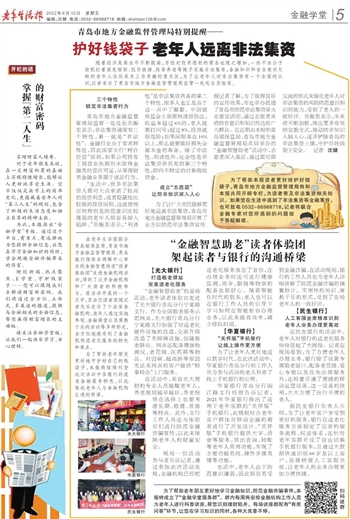 为了帮助本报读者更好地护好钱袋子,青岛市地方金融监督管理局将和本报共同开辟专栏,为读者普及非法集资相关知识。如果您在生活中遇到了非法集资等金融事件,也可致电0532-66988718,记者将联合金融专家对您所遇到的问题给予答疑解惑。