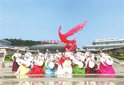 上着素色短上衣,下配艳丽纱裙,身背长鼓,在阳光下翩翩起舞,轻盈静美的姿态,犹如花朵含苞待放。在青岛市志愿者广场的一场表演中,身着朝鲜族服饰亮相的金达莱朝鲜族舞蹈队吸引了众人的目光。“朝鲜族舞这颗民族之花的种子已在青岛生根发芽,我希望金达莱这朵民族之花能在岛城盛开绽放。”团长杨倩说。