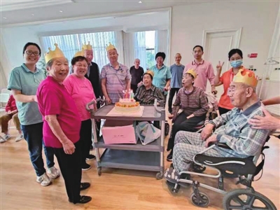 趣味游戏结束后,就开始了今天的重头戏——9月长者生日会,为9月份过生日的老人举行集体生日会。顿时,一楼多功能厅里喜气洋洋,9月份过生日的老人们都戴上了生日帽,工作人员推着生日蛋糕缓缓走进来,蛋糕上插满了生日蜡烛,在烛光的映衬中,老人们和工作人员一起唱起了《生日快乐》歌,最后老人们集体吹灭了生日蜡烛,工作人员随后将生日蛋糕送到了老人的房间中。