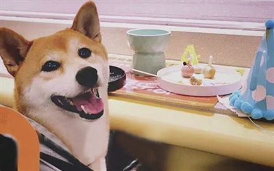 4岁生日的柴犬正在猫狗聚乐部宠物餐厅用餐。