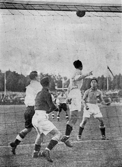 1936年8月6日下午,中国队第一次亮相世界赛场,与英国队在柏林康姆逊球场狭路相逢,现场观众多达万人。比赛一开始,早已洞悉中国队虚实的英国队便严密看防李惠堂,使其纵有绝技也难以施展。上半场,中国队攻势凌厉,一次下底传中后破门,可惜被裁判吹为越位。