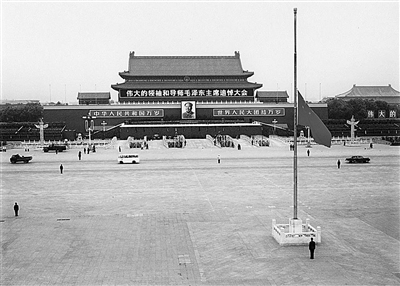 1976年毛泽东逝世,天安门广场降半旗。这一年,周恩来、朱德、毛泽东先后去世,天安门广场三次降半旗。