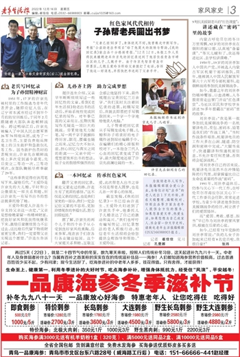 为鼓励老年人写作,本报编辑部联合爱心企业,为每位计划“出书”的老人送出1万元补贴,并在文稿整理、编辑校对、印刷出品等方面为老年人提供全方位的服务。如果您喜爱文学、热爱生活,如果您想为自己或家人、社会留一份文字史料,请致电老年生活报编辑部(0532)66988903报名。