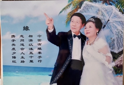 2011年,是我俩结婚50周年即金婚纪念。女儿说:“现在生活水平提高了,您二老赶赶时髦去拍个婚纱照吧。”在女儿的精心安排下,我们来到一家照相馆,馆方给男方提供西服、唐装和领带,给女方提供婚纱,还给与化妆、盘头,配合各种道具、布景,拍出各种姿势的彩色照片多张,最后自选十五张,洗印成影集一本。同时还赠送放大了的三张带相框的大照片。我事先写了一首小诗《缘》:“今世有缘牵手行,相濡以沫五十整,志同道合人生路,携手共度夕阳红”。这首诗洗印在其中一张照片上。这婚纱照美极了!好像给我们补上了一次结婚仪式。