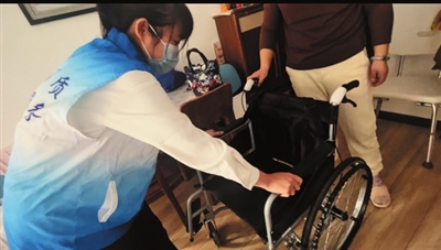 工作人员演示轮椅如何使用