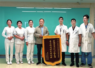 10月16日,在北京大学人民医院青岛院区的三楼病房中,洋溢着一股温馨而欢乐的气氛。青岛市社会福利院副院长任林松及相关工作人员专程送来一面锦旗,上面书写着“医德高尚仁心救危难,医术精湛妙手祛沉疴”,以此表达对医院成功救治福利院一名63岁“三无”老人的深深感激。这位老人无劳动能力、无生活来源、无赡养人和扶养人,是社会福利院的重点照顾对象。
